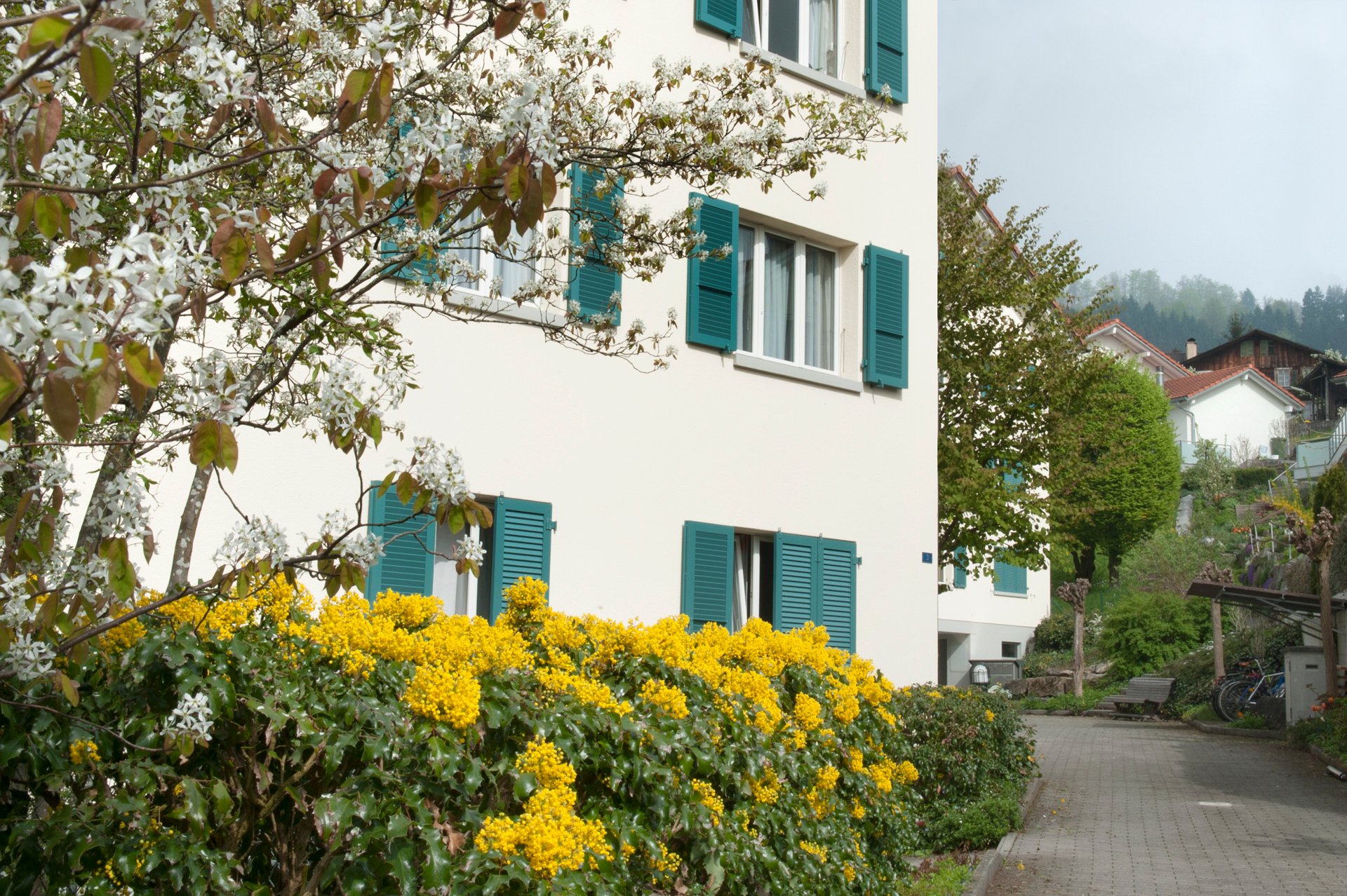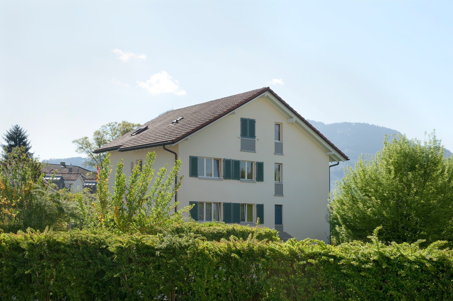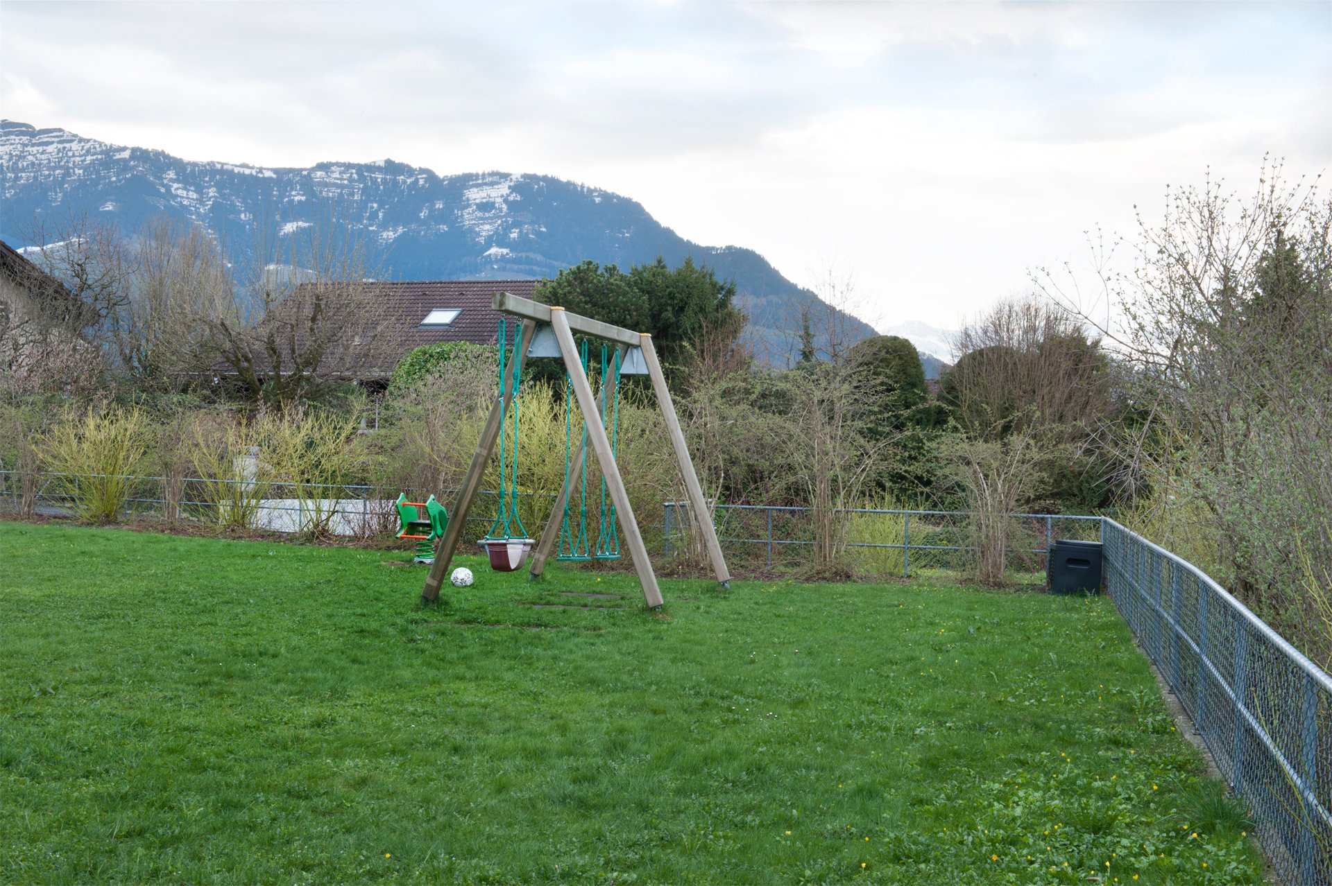 schöne Weitsicht ins Bergpanorama mit Pilatus und Rigi. Eine grosszügige Grünfläche umgibt die beiden Liegenschaften mit Kinderspielplatz und Sitzbereich unter den Bäumen. In den Jahren 2006 bis